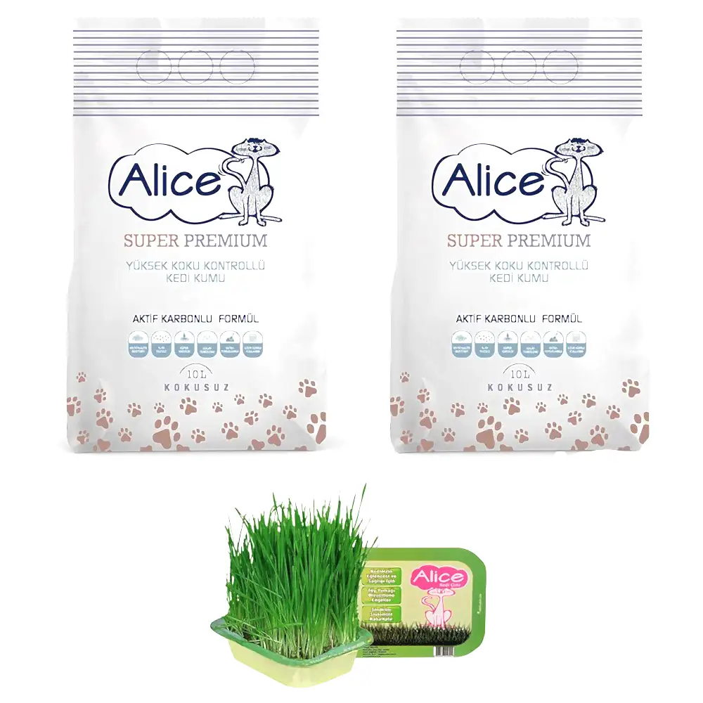 Alice Aktif Karbonlu Super Premium Topaklaşan Kedi Kumu 2×10 LT ve Alice Kedi Çimi