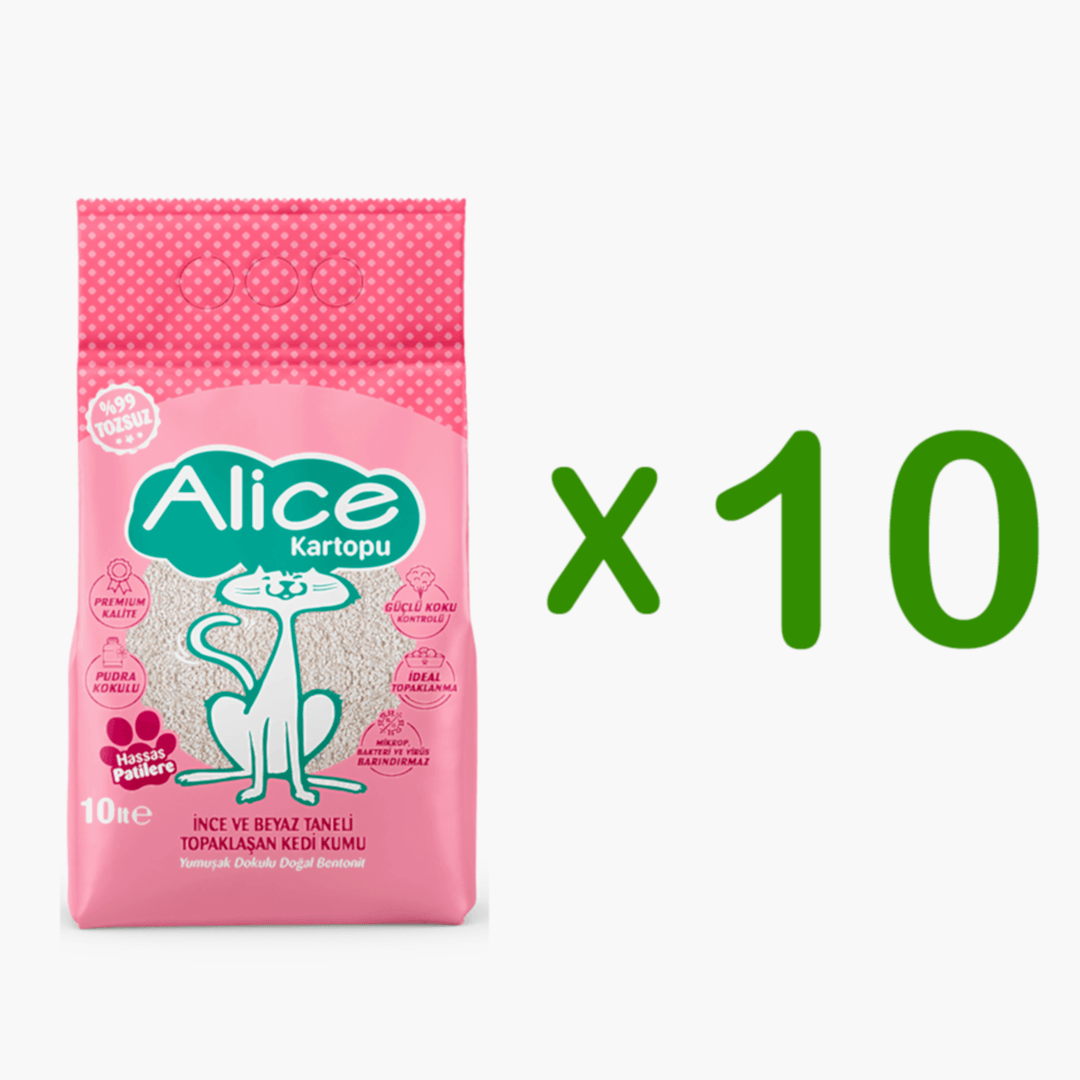 Alice İnce ve Beyaz Taneli Topaklaşan Pudra Kokulu Kedi Kumu 10×10 lt – 10 Adet(GEL-AL ÜRÜNÜDÜR, KARGOLANMAZ)