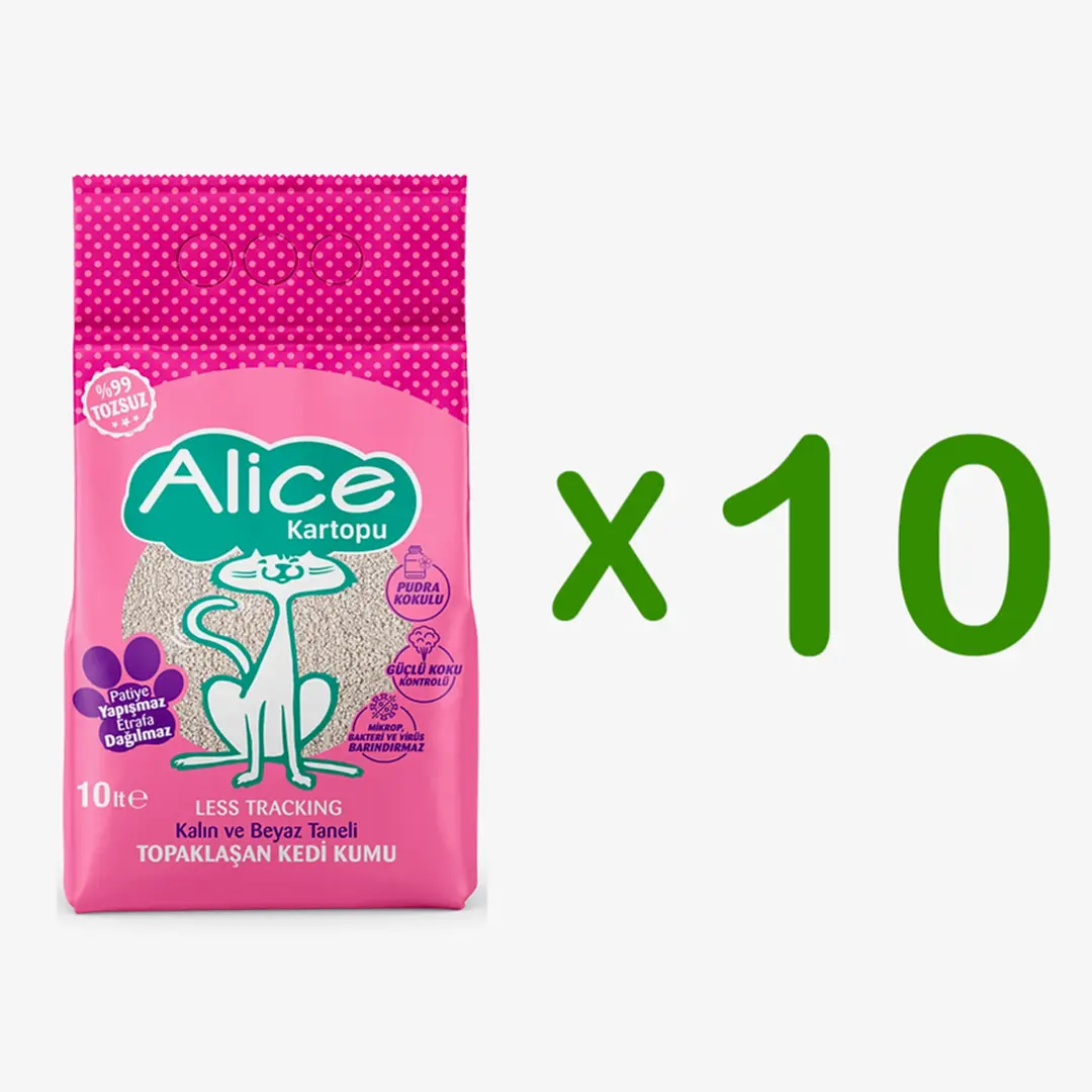 Alice Kalın ve Beyaz Taneli Topaklaşan Pudra Kokulu Kedi Kumu 10×10 lt – 10 Adet(GEL-AL ÜRÜNÜDÜR, KARGOLANMAZ)
