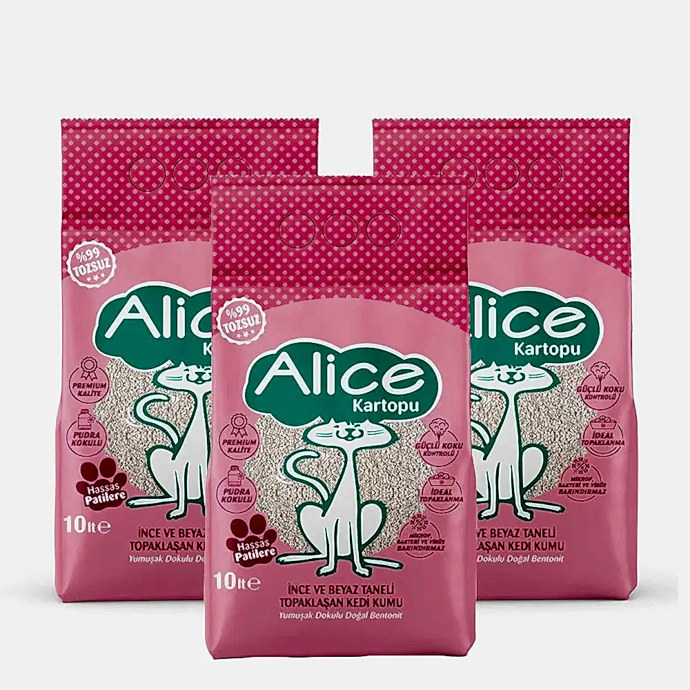 Alice Kartopu İnce ve Beyaz Taneli Pudra Kokulu Kedi Kumu 3×10 lt.