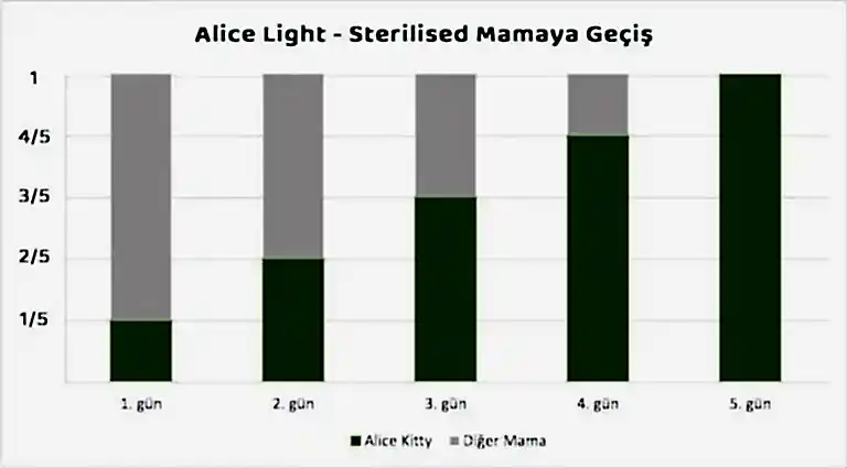 Kedinizin kolaylıkla Alice Light & Sterilised Kedi Mamasına geçebilmesi için 5 günlük bir süre içinde şu an yediği mamaya gittikçe artan oranlarda Alice Light & Sterilised karıştırmanız tavsiye edilir.
