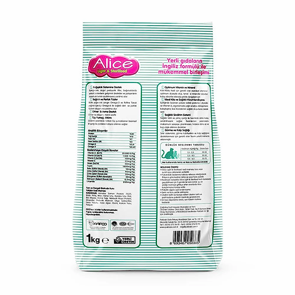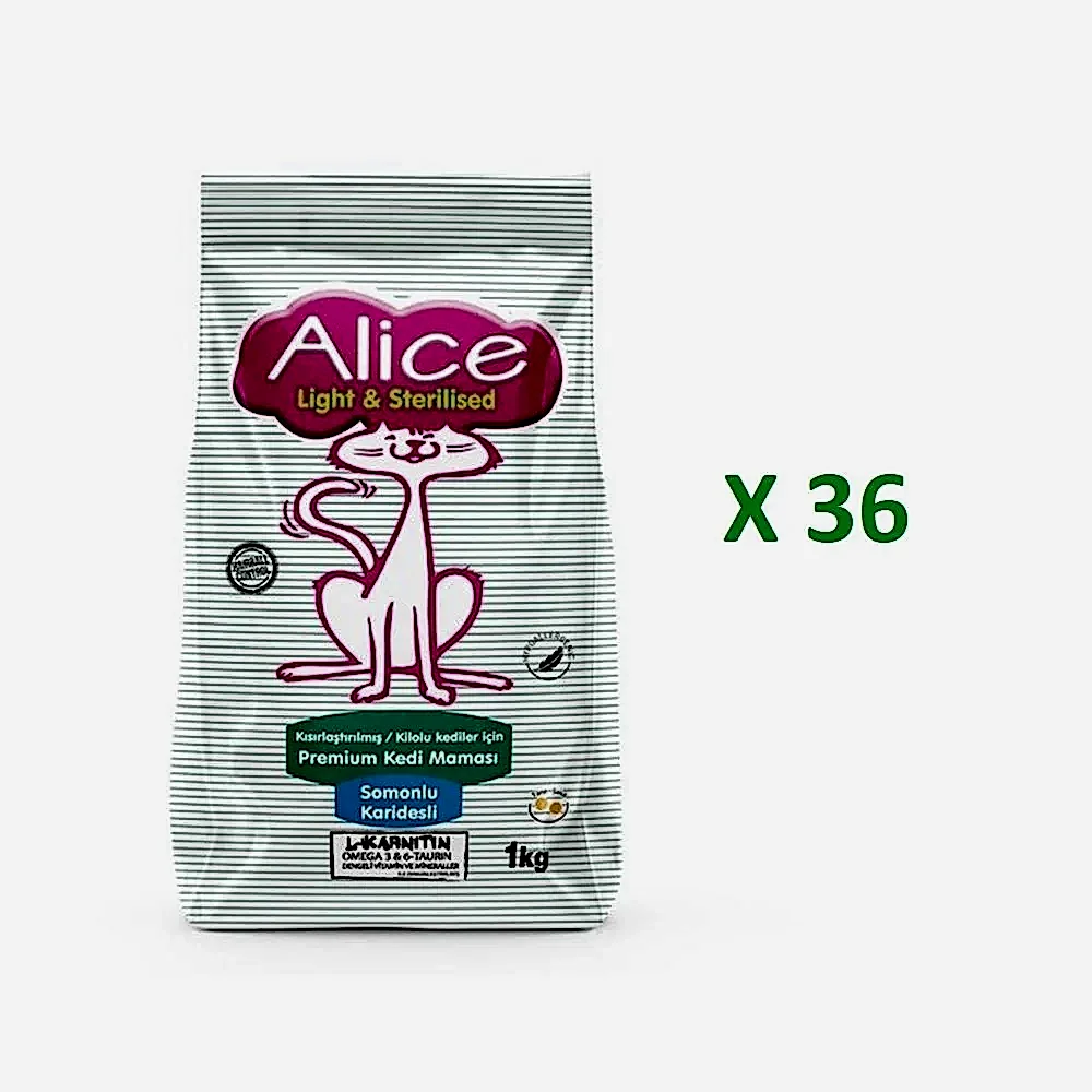 Alice Light & Sterilised – Kısırlaştırılmış / Kilolu Kediler İçin Super Premium Mama Somonlu Karidesli 1 kg x 36 Adet (3 koli)(GEL-AL ÜRÜNÜDÜR, KARGOLANMAZ)
