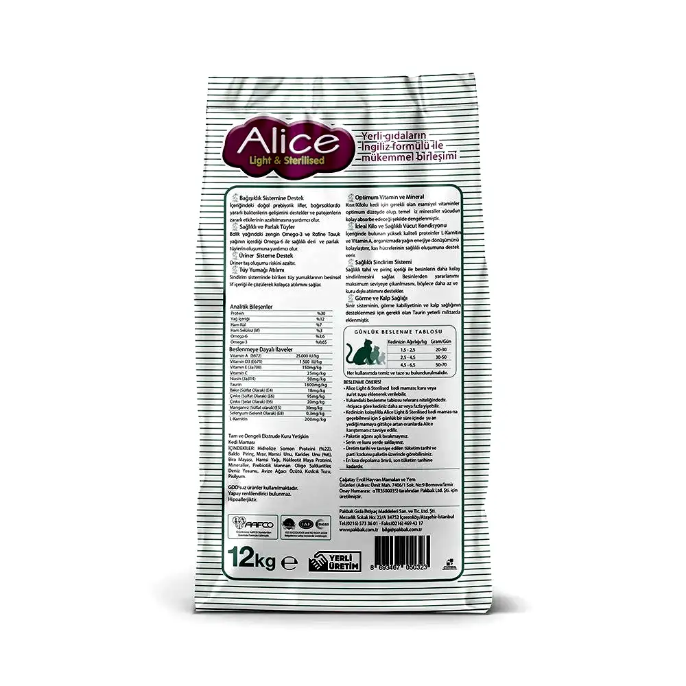 Alice Light & Sterilised – Kısırlaştırılmış / Kilolu Kediler İçin Super Premium Mama Somonlu Karidesli 12 kg (Kısır ve/veya Kilolu)
