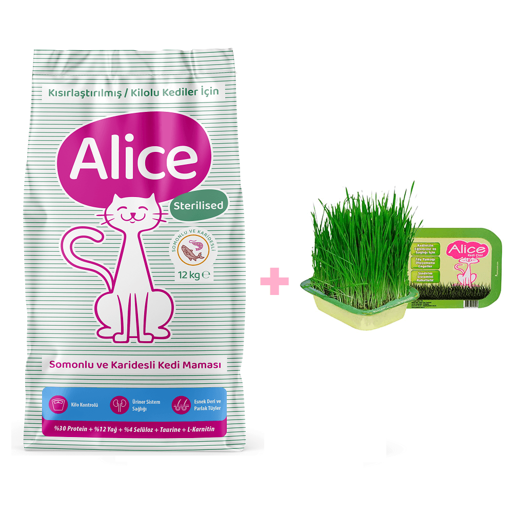 Alice Kısırlaştırılmış / Kilolu Kediler İçin Super Premium Mama Somonlu Karidesli 12 kg (Kısır ve/veya Kilolu) + Kedi Çimi