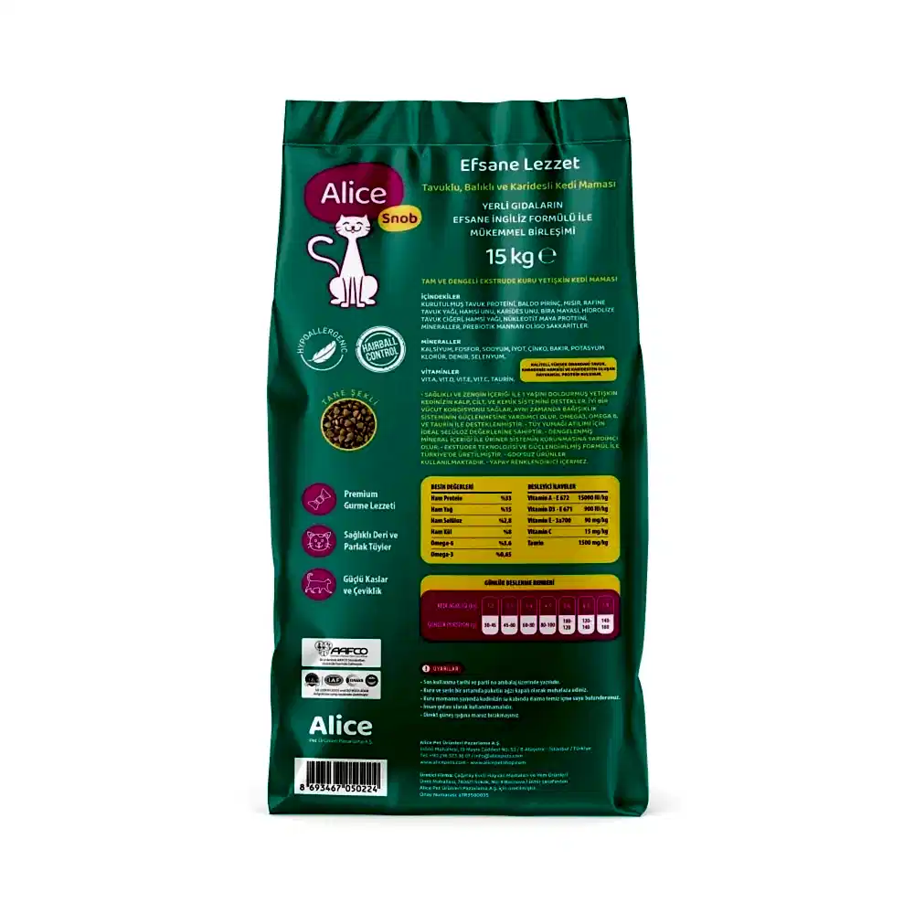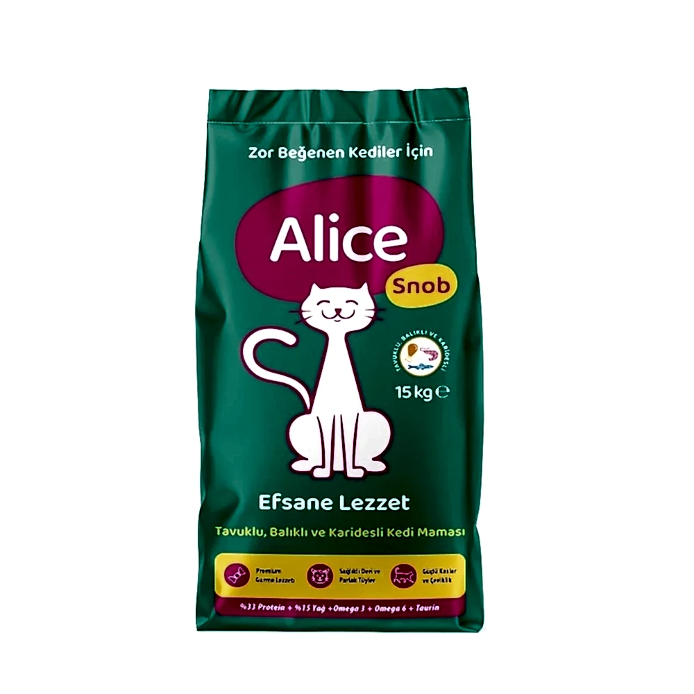 - Gurme lezzeti: Alice Snob gurme lezzetiyle zor beğenen kedilerin bile tercih ettiği bir mamadır. Tavuk ve balık tadı, tazeliği, uygun büyüklük ve tanecik yapısı ile kedilerin her zaman favorisidir.